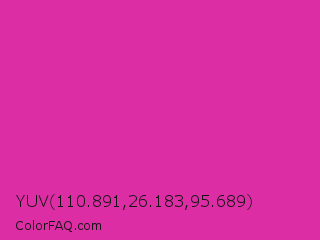 YUV 110.891,26.183,95.689 Color is a normal magenta color and the nearest color is Frostbite #e936a7. Hex code #dc2da4 and RGB value is rgb(220,45,164). In RGB color space, this color is composed of 86% red, 18% green, 64% blue, In CMYK color space, this color is composed of 0% cyan, 80% magenta, 25% yellow , 14% black , In HSL color space, this color has a hue angle of 319° , 71% saturation and 52% lightness.