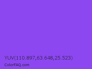 YUV 110.897,63.648,25.523 Color is a light violet color and the nearest color is Navy Purple #9457eb. Hex code #8c47f0 and RGB value is rgb(140,71,240). In RGB color space, this color is composed of 55% red, 28% green, 94% blue, In CMYK color space, this color is composed of 42% cyan, 70% magenta, 0% yellow , 6% black , In HSL color space, this color has a hue angle of 264° , 85% saturation and 61% lightness.