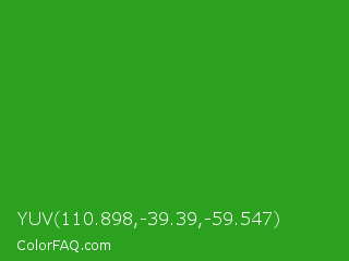 YUV 110.898,-39.39,-59.547 Color is a normal green color and the nearest color is Slimy Green #299617. Hex code #2ba11f and RGB value is rgb(43,161,31). In RGB color space, this color is composed of 17% red, 63% green, 12% blue, In CMYK color space, this color is composed of 73% cyan, 0% magenta, 81% yellow , 37% black , In HSL color space, this color has a hue angle of 114° , 68% saturation and 38% lightness.