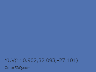 YUV 110.902,32.093,-27.101 Color is a normal blue color and the nearest color is Blue Yonder #5072a7. Hex code #5072b0 and RGB value is rgb(80,114,176). In RGB color space, this color is composed of 31% red, 45% green, 69% blue, In CMYK color space, this color is composed of 55% cyan, 35% magenta, 0% yellow , 31% black , In HSL color space, this color has a hue angle of 219° , 38% saturation and 50% lightness.