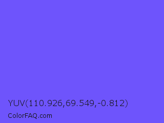 YUV 110.926,69.549,-0.812 Color is a light indigo color and the nearest color is Very Light Blue #6666ff. Hex code #6e54fc and RGB value is rgb(110,84,252). In RGB color space, this color is composed of 43% red, 33% green, 99% blue, In CMYK color space, this color is composed of 56% cyan, 67% magenta, 0% yellow , 1% black , In HSL color space, this color has a hue angle of 249° , 97% saturation and 66% lightness.