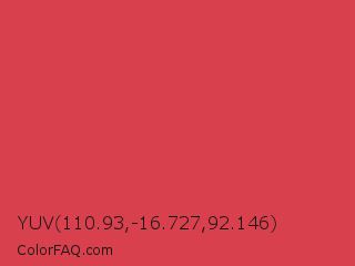 YUV 110.93,-16.727,92.146 Color is a normal red color and the nearest color is English Vermillion #cc474b. Hex code #d8404d and RGB value is rgb(216,64,77). In RGB color space, this color is composed of 85% red, 25% green, 30% blue, In CMYK color space, this color is composed of 0% cyan, 70% magenta, 64% yellow , 15% black , In HSL color space, this color has a hue angle of 355° , 66% saturation and 55% lightness.
