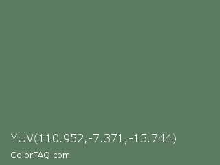 YUV 110.952,-7.371,-15.744 Color is a normal green color and the nearest color is Glade Green #61845f. Hex code #5d7b60 and RGB value is rgb(93,123,96). In RGB color space, this color is composed of 36% red, 48% green, 38% blue, In CMYK color space, this color is composed of 24% cyan, 0% magenta, 22% yellow , 52% black , In HSL color space, this color has a hue angle of 126° , 14% saturation and 42% lightness.