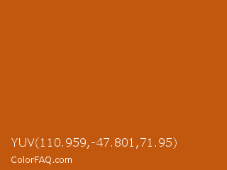 YUV 110.959,-47.801,71.95 Color is a normal orange color and the nearest color is Alloy Orange #c46210. Hex code #c1580e and RGB value is rgb(193,88,14). In RGB color space, this color is composed of 76% red, 35% green, 5% blue, In CMYK color space, this color is composed of 0% cyan, 54% magenta, 93% yellow , 24% black , In HSL color space, this color has a hue angle of 25° , 86% saturation and 41% lightness.