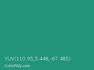 YUV 110.95,5.448,-67.485 Color is a normal cyan color and the nearest color is Illuminating Emerald #319177. Hex code #22947a and RGB value is rgb(34,148,122). In RGB color space, this color is composed of 13% red, 58% green, 48% blue, In CMYK color space, this color is composed of 77% cyan, 0% magenta, 18% yellow , 42% black , In HSL color space, this color has a hue angle of 166° , 63% saturation and 36% lightness.