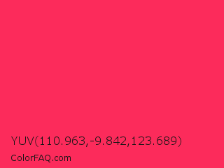 YUV 110.963,-9.842,123.689 Color is a normal red color and the nearest color is Radical Red #ff355e. Hex code #fc2b5b and RGB value is rgb(252,43,91). In RGB color space, this color is composed of 99% red, 17% green, 36% blue, In CMYK color space, this color is composed of 0% cyan, 83% magenta, 64% yellow , 1% black , In HSL color space, this color has a hue angle of 346° , 97% saturation and 58% lightness.