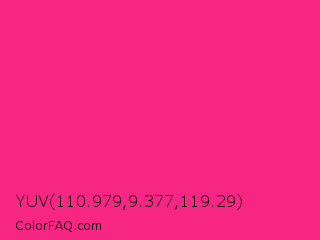 YUV 110.979,9.377,119.29 Color is a normal rose color and the nearest color is Cerise Pink #ec3b83. Hex code #f72682 and RGB value is rgb(247,38,130). In RGB color space, this color is composed of 97% red, 15% green, 51% blue, In CMYK color space, this color is composed of 0% cyan, 85% magenta, 47% yellow , 3% black , In HSL color space, this color has a hue angle of 334° , 93% saturation and 56% lightness.
