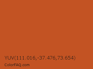 YUV 111.016,-37.476,73.654 Color is a normal orange color and the nearest color is Orange Roughy #c45719. Hex code #c35323 and RGB value is rgb(195,83,35). In RGB color space, this color is composed of 76% red, 33% green, 14% blue, In CMYK color space, this color is composed of 0% cyan, 57% magenta, 82% yellow , 24% black , In HSL color space, this color has a hue angle of 18° , 70% saturation and 45% lightness.