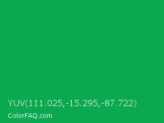 YUV 111.025,-15.295,-87.722 Color is a normal green color and the nearest color is Green Pigment #00a550. Hex code #0ba850 and RGB value is rgb(11,168,80). In RGB color space, this color is composed of 4% red, 66% green, 31% blue, In CMYK color space, this color is composed of 93% cyan, 0% magenta, 52% yellow , 34% black , In HSL color space, this color has a hue angle of 146° , 88% saturation and 35% lightness.