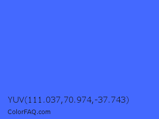 YUV 111.037,70.974,-37.743 Color is a light blue color and the nearest color is Ultramarine Blue #4166f5. Hex code #4469ff and RGB value is rgb(68,105,255). In RGB color space, this color is composed of 27% red, 41% green, 100% blue, In CMYK color space, this color is composed of 73% cyan, 59% magenta, 0% yellow , 0% black , In HSL color space, this color has a hue angle of 228° , 100% saturation and 63% lightness.