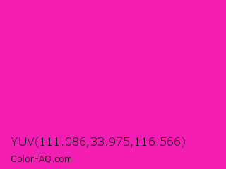 YUV 111.086,33.975,116.566 Color is a normal magenta color and the nearest color is Shocking Pink #fc0fc0. Hex code #f41eb4 and RGB value is rgb(244,30,180). In RGB color space, this color is composed of 96% red, 12% green, 71% blue, In CMYK color space, this color is composed of 0% cyan, 88% magenta, 26% yellow , 4% black , In HSL color space, this color has a hue angle of 318° , 91% saturation and 54% lightness.
