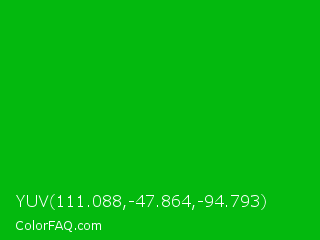 YUV 111.088,-47.864,-94.793 Color is a normal green color and the nearest color is Vivid Malachite #00cc33. Hex code #03b90e and RGB value is rgb(3,185,14). In RGB color space, this color is composed of 1% red, 73% green, 5% blue, In CMYK color space, this color is composed of 98% cyan, 0% magenta, 92% yellow , 27% black , In HSL color space, this color has a hue angle of 124° , 97% saturation and 37% lightness.