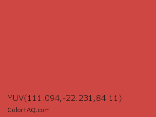 YUV 111.094,-22.231,84.11 Color is a normal red color and the nearest color is English Vermillion #cc474b. Hex code #cf4742 and RGB value is rgb(207,71,66). In RGB color space, this color is composed of 81% red, 28% green, 26% blue, In CMYK color space, this color is composed of 0% cyan, 66% magenta, 68% yellow , 19% black , In HSL color space, this color has a hue angle of 2° , 59% saturation and 54% lightness.