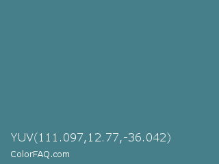 YUV 111.097,12.77,-36.042 Color is a normal cyan color and the nearest color is Smalt Blue #51808f. Hex code #467f89 and RGB value is rgb(70,127,137). In RGB color space, this color is composed of 27% red, 50% green, 54% blue, In CMYK color space, this color is composed of 49% cyan, 7% magenta, 0% yellow , 46% black , In HSL color space, this color has a hue angle of 189° , 32% saturation and 41% lightness.