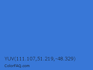 YUV 111.107,51.219,-48.329 Color is a normal blue color and the nearest color is Han Blue #446ccf. Hex code #3877d7 and RGB value is rgb(56,119,215). In RGB color space, this color is composed of 22% red, 47% green, 84% blue, In CMYK color space, this color is composed of 74% cyan, 45% magenta, 0% yellow , 16% black , In HSL color space, this color has a hue angle of 216° , 67% saturation and 53% lightness.