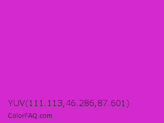 YUV 111.113,46.286,87.601 Color is a normal magenta color and the nearest color is Steel Pink #cc33cc. Hex code #d32acd and RGB value is rgb(211,42,205). In RGB color space, this color is composed of 83% red, 16% green, 80% blue, In CMYK color space, this color is composed of 0% cyan, 80% magenta, 3% yellow , 17% black , In HSL color space, this color has a hue angle of 302° , 67% saturation and 50% lightness.