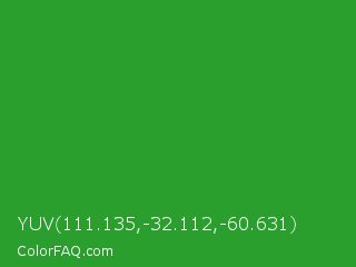 YUV 111.135,-32.112,-60.631 Color is a normal green color and the nearest color is Wageningen Green #34b233. Hex code #2a9f2e and RGB value is rgb(42,159,46). In RGB color space, this color is composed of 16% red, 62% green, 18% blue, In CMYK color space, this color is composed of 74% cyan, 0% magenta, 71% yellow , 38% black , In HSL color space, this color has a hue angle of 122° , 58% saturation and 39% lightness.
