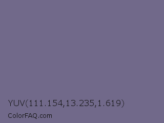 YUV 111.154,13.235,1.619 Color is a normal indigo color and the nearest color is Rum #796989. Hex code #71698a and RGB value is rgb(113,105,138). In RGB color space, this color is composed of 44% red, 41% green, 54% blue, In CMYK color space, this color is composed of 18% cyan, 24% magenta, 0% yellow , 46% black , In HSL color space, this color has a hue angle of 255° , 14% saturation and 48% lightness.