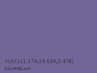YUV 111.174,19.634,2.478 Color is a normal indigo color and the nearest color is Kimberly #736c9f. Hex code #726697 and RGB value is rgb(114,102,151). In RGB color space, this color is composed of 45% red, 40% green, 59% blue, In CMYK color space, this color is composed of 25% cyan, 32% magenta, 0% yellow , 41% black , In HSL color space, this color has a hue angle of 255° , 19% saturation and 50% lightness.