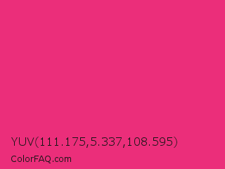 YUV 111.175,5.337,108.595 Color is a normal rose color and the nearest color is Cerise Pink #ec3b83. Hex code #eb2e7a and RGB value is rgb(235,46,122). In RGB color space, this color is composed of 92% red, 18% green, 48% blue, In CMYK color space, this color is composed of 0% cyan, 80% magenta, 48% yellow , 8% black , In HSL color space, this color has a hue angle of 336° , 83% saturation and 55% lightness.