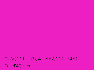 YUV 111.176,40.832,110.348 Color is a normal magenta color and the nearest color is Hot Magenta #ff1dce. Hex code #ed1fc2 and RGB value is rgb(237,31,194). In RGB color space, this color is composed of 93% red, 12% green, 76% blue, In CMYK color space, this color is composed of 0% cyan, 87% magenta, 18% yellow , 7% black , In HSL color space, this color has a hue angle of 313° , 85% saturation and 53% lightness.