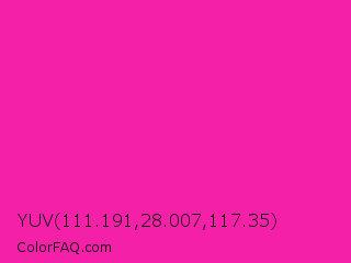 YUV 111.191,28.007,117.35 Color is a normal magenta color and the nearest color is Persian Rose #fe28a2. Hex code #f520a8 and RGB value is rgb(245,32,168). In RGB color space, this color is composed of 96% red, 13% green, 66% blue, In CMYK color space, this color is composed of 0% cyan, 87% magenta, 31% yellow , 4% black , In HSL color space, this color has a hue angle of 322° , 91% saturation and 54% lightness.