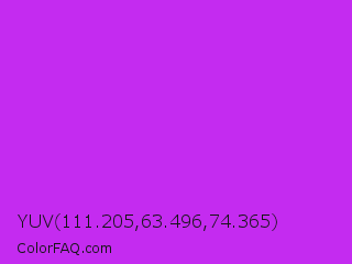 YUV 111.205,63.496,74.365 Color is a normal purple color and the nearest color is Vivid Mulberry #b80ce3. Hex code #c42bf0 and RGB value is rgb(196,43,240). In RGB color space, this color is composed of 77% red, 17% green, 94% blue, In CMYK color space, this color is composed of 18% cyan, 82% magenta, 0% yellow , 6% black , In HSL color space, this color has a hue angle of 287° , 87% saturation and 55% lightness.