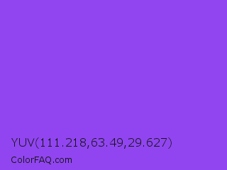YUV 111.218,63.49,29.627 Color is a light violet color and the nearest color is Navy Purple #9457eb. Hex code #9145f0 and RGB value is rgb(145,69,240). In RGB color space, this color is composed of 57% red, 27% green, 94% blue, In CMYK color space, this color is composed of 40% cyan, 71% magenta, 0% yellow , 6% black , In HSL color space, this color has a hue angle of 267° , 85% saturation and 61% lightness.