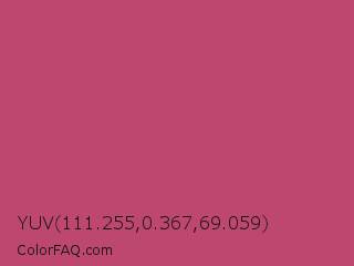 YUV 111.255,0.367,69.059 Color is a normal rose color and the nearest color is Fuchsia Rose #c74375. Hex code #be4770 and RGB value is rgb(190,71,112). In RGB color space, this color is composed of 75% red, 28% green, 44% blue, In CMYK color space, this color is composed of 0% cyan, 63% magenta, 41% yellow , 25% black , In HSL color space, this color has a hue angle of 339° , 48% saturation and 51% lightness.