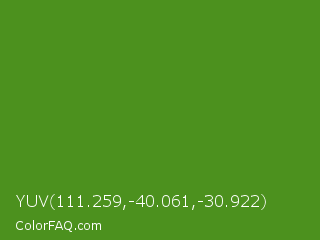 YUV 111.259,-40.061,-30.922 Color is a normal green color and the nearest color is Vida Loca #549019. Hex code #4c911e and RGB value is rgb(76,145,30). In RGB color space, this color is composed of 30% red, 57% green, 12% blue, In CMYK color space, this color is composed of 48% cyan, 0% magenta, 79% yellow , 43% black , In HSL color space, this color has a hue angle of 96° , 66% saturation and 34% lightness.