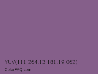 YUV 111.264,13.181,19.062 Color is a normal magenta color and the nearest color is Chinese Violet #856088. Hex code #855f8a and RGB value is rgb(133,95,138). In RGB color space, this color is composed of 52% red, 37% green, 54% blue, In CMYK color space, this color is composed of 4% cyan, 31% magenta, 0% yellow , 46% black , In HSL color space, this color has a hue angle of 293° , 18% saturation and 46% lightness.