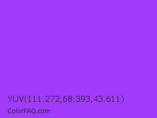 YUV 111.272,68.393,43.611 Color is a light purple color and the nearest color is Veronica #a020f0. Hex code #a13bfa and RGB value is rgb(161,59,250). In RGB color space, this color is composed of 63% red, 23% green, 98% blue, In CMYK color space, this color is composed of 36% cyan, 76% magenta, 0% yellow , 2% black , In HSL color space, this color has a hue angle of 272° , 95% saturation and 61% lightness.