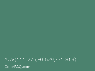 YUV 111.275,-0.629,-31.813 Color is a normal green color and the nearest color is Hookers Green #49796b. Hex code #4b826e and RGB value is rgb(75,130,110). In RGB color space, this color is composed of 29% red, 51% green, 43% blue, In CMYK color space, this color is composed of 42% cyan, 0% magenta, 15% yellow , 49% black , In HSL color space, this color has a hue angle of 158° , 27% saturation and 40% lightness.