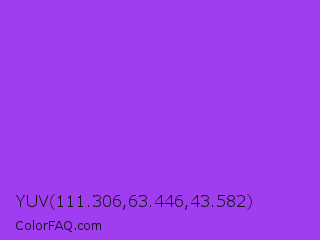 YUV 111.306,63.446,43.582 Color is a normal purple color and the nearest color is Veronica #a020f0. Hex code #a13df0 and RGB value is rgb(161,61,240). In RGB color space, this color is composed of 63% red, 24% green, 94% blue, In CMYK color space, this color is composed of 33% cyan, 75% magenta, 0% yellow , 6% black , In HSL color space, this color has a hue angle of 274° , 86% saturation and 59% lightness.