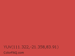 YUV 111.322,-21.358,83.91 Color is a normal red color and the nearest color is English Vermillion #cc474b. Hex code #cf4744 and RGB value is rgb(207,71,68). In RGB color space, this color is composed of 81% red, 28% green, 27% blue, In CMYK color space, this color is composed of 0% cyan, 66% magenta, 67% yellow , 19% black , In HSL color space, this color has a hue angle of 1° , 59% saturation and 54% lightness.
