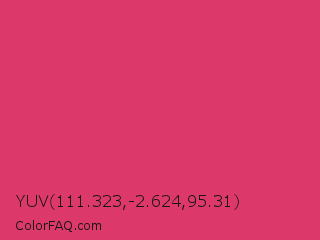 YUV 111.323,-2.624,95.31 Color is a normal rose color and the nearest color is Cerise Red #de3163. Hex code #dc396a and RGB value is rgb(220,57,106). In RGB color space, this color is composed of 86% red, 22% green, 42% blue, In CMYK color space, this color is composed of 0% cyan, 74% magenta, 52% yellow , 14% black , In HSL color space, this color has a hue angle of 342° , 70% saturation and 54% lightness.