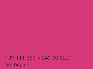 YUV 111.353,5.249,90.021 Color is a normal rose color and the nearest color is Telemagenta #cf3476. Hex code #d6397a and RGB value is rgb(214,57,122). In RGB color space, this color is composed of 84% red, 22% green, 48% blue, In CMYK color space, this color is composed of 0% cyan, 73% magenta, 43% yellow , 16% black , In HSL color space, this color has a hue angle of 335° , 66% saturation and 53% lightness.