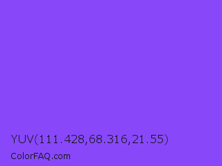 YUV 111.428,68.316,21.55 Color is a light violet color and the nearest color is Navy Purple #9457eb. Hex code #8848fa and RGB value is rgb(136,72,250). In RGB color space, this color is composed of 53% red, 28% green, 98% blue, In CMYK color space, this color is composed of 46% cyan, 71% magenta, 0% yellow , 2% black , In HSL color space, this color has a hue angle of 262° , 95% saturation and 63% lightness.