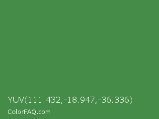 YUV 111.432,-18.947,-36.336 Color is a normal green color and the nearest color is May Green #4c9141. Hex code #468c49 and RGB value is rgb(70,140,73). In RGB color space, this color is composed of 27% red, 55% green, 29% blue, In CMYK color space, this color is composed of 50% cyan, 0% magenta, 48% yellow , 45% black , In HSL color space, this color has a hue angle of 123° , 33% saturation and 41% lightness.