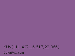 YUV 111.497,16.517,22.366 Color is a normal purple color and the nearest color is French Lilac #86608e. Hex code #895c91 and RGB value is rgb(137,92,145). In RGB color space, this color is composed of 54% red, 36% green, 57% blue, In CMYK color space, this color is composed of 6% cyan, 37% magenta, 0% yellow , 43% black , In HSL color space, this color has a hue angle of 291° , 22% saturation and 46% lightness.