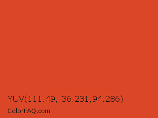 YUV 111.49,-36.231,94.286 Color is a normal red color and the nearest color is Punch #dc4333. Hex code #db4726 and RGB value is rgb(219,71,38). In RGB color space, this color is composed of 86% red, 28% green, 15% blue, In CMYK color space, this color is composed of 0% cyan, 68% magenta, 83% yellow , 14% black , In HSL color space, this color has a hue angle of 11° , 72% saturation and 50% lightness.