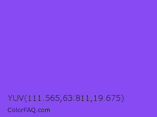 YUV 111.565,63.811,19.675 Color is a light violet color and the nearest color is Navy Purple #9457eb. Hex code #864bf1 and RGB value is rgb(134,75,241). In RGB color space, this color is composed of 53% red, 29% green, 95% blue, In CMYK color space, this color is composed of 44% cyan, 69% magenta, 0% yellow , 5% black , In HSL color space, this color has a hue angle of 261° , 86% saturation and 62% lightness.