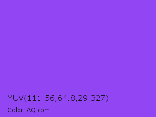 YUV 111.56,64.8,29.327 Color is a light violet color and the nearest color is Navy Purple #9457eb. Hex code #9145f3 and RGB value is rgb(145,69,243). In RGB color space, this color is composed of 57% red, 27% green, 95% blue, In CMYK color space, this color is composed of 40% cyan, 72% magenta, 0% yellow , 5% black , In HSL color space, this color has a hue angle of 266° , 88% saturation and 61% lightness.