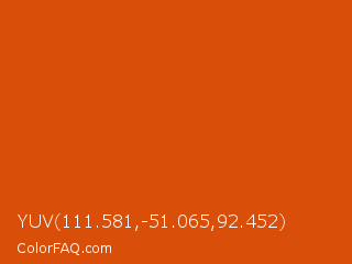 YUV 111.581,-51.065,92.452 Color is a normal orange color and the nearest color is Grenadier #d54600. Hex code #d94e08 and RGB value is rgb(217,78,8). In RGB color space, this color is composed of 85% red, 31% green, 3% blue, In CMYK color space, this color is composed of 0% cyan, 64% magenta, 96% yellow , 15% black , In HSL color space, this color has a hue angle of 20° , 93% saturation and 44% lightness.