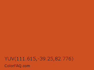 YUV 111.615,-39.25,82.776 Color is a normal orange color and the nearest color is Orange Roughy #c45719. Hex code #ce4f20 and RGB value is rgb(206,79,32). In RGB color space, this color is composed of 81% red, 31% green, 13% blue, In CMYK color space, this color is composed of 0% cyan, 62% magenta, 84% yellow , 19% black , In HSL color space, this color has a hue angle of 16° , 73% saturation and 47% lightness.