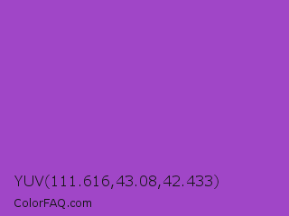 YUV 111.616,43.08,42.433 Color is a normal purple color and the nearest color is Deep Lilac #9955bb. Hex code #a046c7 and RGB value is rgb(160,70,199). In RGB color space, this color is composed of 63% red, 27% green, 78% blue, In CMYK color space, this color is composed of 20% cyan, 65% magenta, 0% yellow , 22% black , In HSL color space, this color has a hue angle of 282° , 54% saturation and 53% lightness.