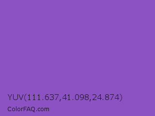 YUV 111.637,41.098,24.874 Color is a normal purple color and the nearest color is Deep Lilac #9955bb. Hex code #8c51c3 and RGB value is rgb(140,81,195). In RGB color space, this color is composed of 55% red, 32% green, 76% blue, In CMYK color space, this color is composed of 28% cyan, 58% magenta, 0% yellow , 24% black , In HSL color space, this color has a hue angle of 271° , 49% saturation and 54% lightness.