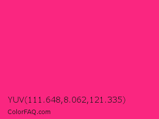 YUV 111.648,8.062,121.335 Color is a normal rose color and the nearest color is Cerise Pink #ec3b83. Hex code #fa2680 and RGB value is rgb(250,38,128). In RGB color space, this color is composed of 98% red, 15% green, 50% blue, In CMYK color space, this color is composed of 0% cyan, 85% magenta, 49% yellow , 2% black , In HSL color space, this color has a hue angle of 335° , 95% saturation and 56% lightness.