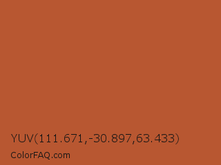 YUV 111.671,-30.897,63.433 Color is a normal orange color and the nearest color is Tuscany #bd5e2e. Hex code #b85731 and RGB value is rgb(184,87,49). In RGB color space, this color is composed of 72% red, 34% green, 19% blue, In CMYK color space, this color is composed of 0% cyan, 53% magenta, 73% yellow , 28% black , In HSL color space, this color has a hue angle of 17° , 58% saturation and 46% lightness.