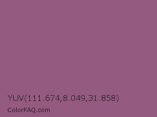 YUV 111.674,8.049,31.858 Color is a normal magenta color and the nearest color is Antique Fuchsia #915c83. Hex code #945a80 and RGB value is rgb(148,90,128). In RGB color space, this color is composed of 58% red, 35% green, 50% blue, In CMYK color space, this color is composed of 0% cyan, 39% magenta, 14% yellow , 42% black , In HSL color space, this color has a hue angle of 321° , 24% saturation and 47% lightness.